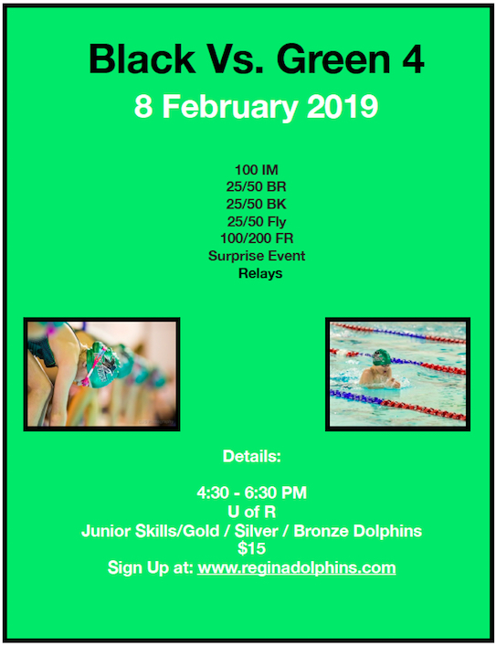 We are looking forward to hosting another Pre-Comp Black V. Green on Feb 8 at the U of R, and encourage everyone to attend. Not only does your swimmer get to show off their skills but they also get a look at how a swim meet runs and swim with Pre-Comp from Moose Jaw. Please click the link in the Upcoming events and sign up your swimmer.